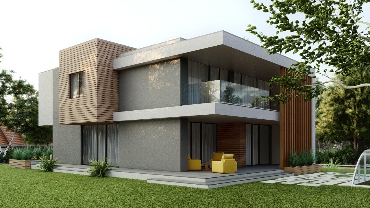 Această casă modernă cu regim de înălțime parter și etaj impresionează prin designul contemporan și accentul pus pe funcționalitate și eficiență energetică. La parter, se regăsesc un living room spațios cu loc de luat masa, o bucătărie deschisă, o cameră tehnică, un birou și o baie, toate concepute pentru a maximiza confortul și utilizarea eficientă a spațiului. La etaj, casa dispune de două dormitoare generoase, fiecare dotat cu baie proprie și dressing, oferind intimitate și confort sporit. Ferestrele înalte asigură o iluminare naturală optimă, creând o legătură armonioasă cu exteriorul. Fațada este placată cu riflaje din lemn și include balcoane ample, integrate perfect în peisajul natural. Realizată pe o structură in cadre, această locuință sustenabilă utilizează materiale de construcție moderne, contribuind la o amprentă de carbon redusă.