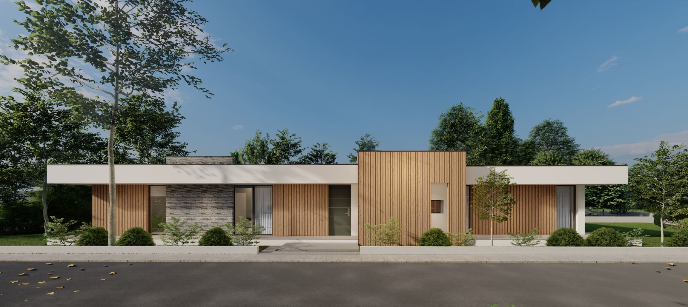Situata in Snagov, in apropierea padurii, aceasta casă modernă cu un singur nivel, este caracterizată de un design minimalist și o estetică contemporană, ideală pentru un teren îngust. Fațada este placată cu riflaje din lemn și piatră naturală, elemente ce oferă un aspect elegant și cald, integrând casa în peisajul natural din jur. Ferestrele înalte permit pătrunderea generosă a luminii naturale, contribuind la un consum redus de energie și la crearea unui spațiu interior luminos și confortabil.