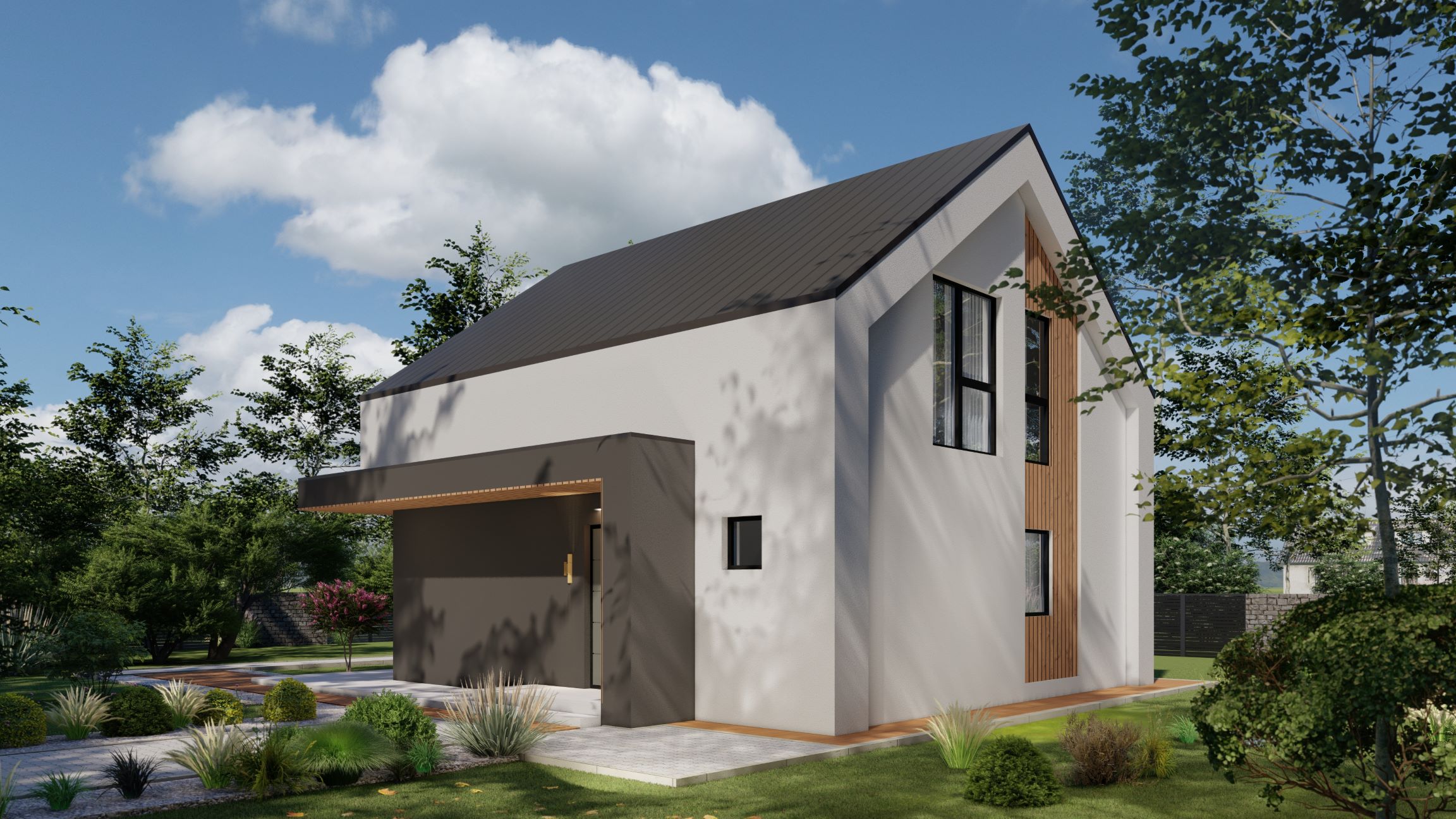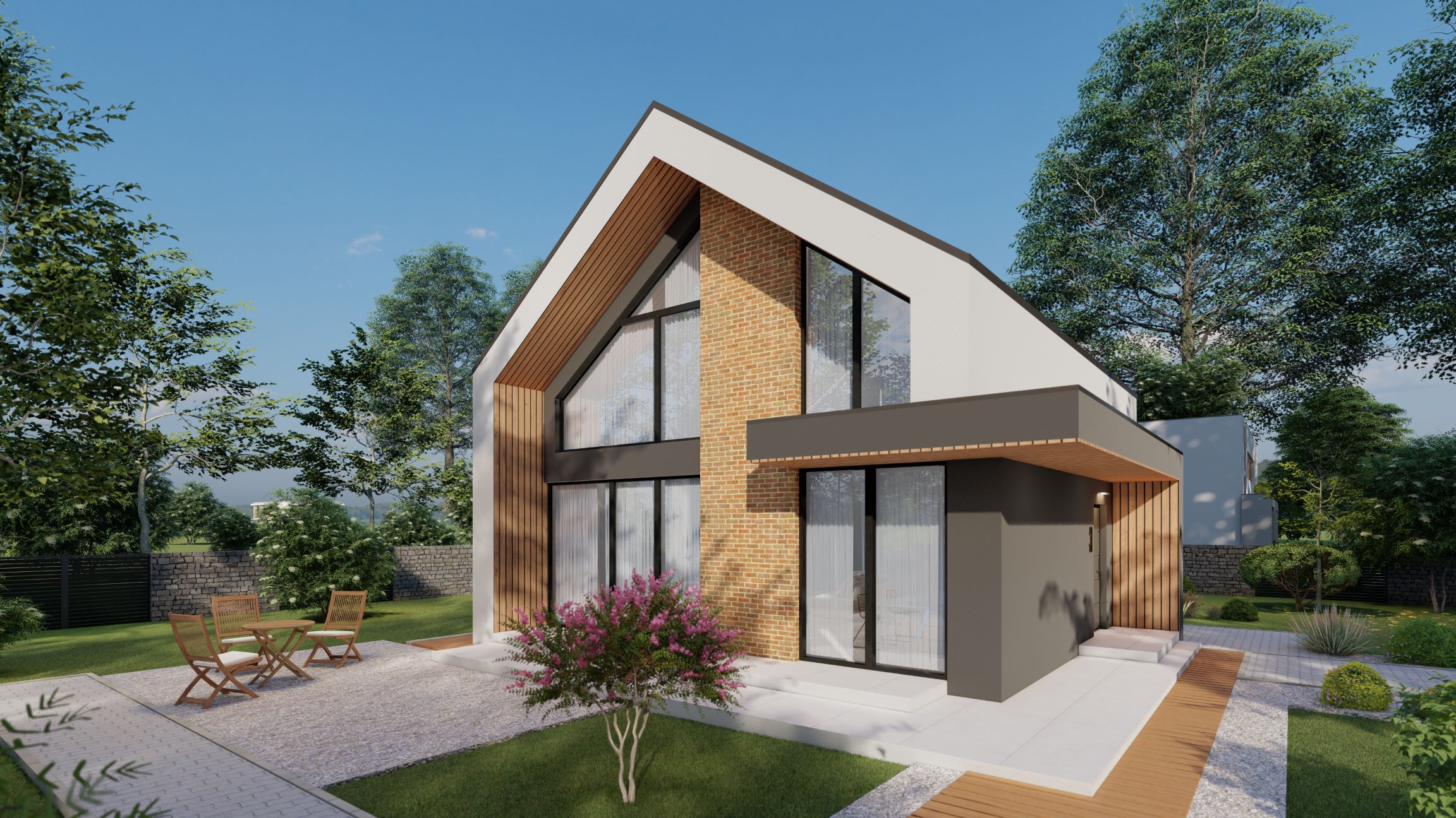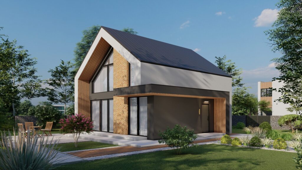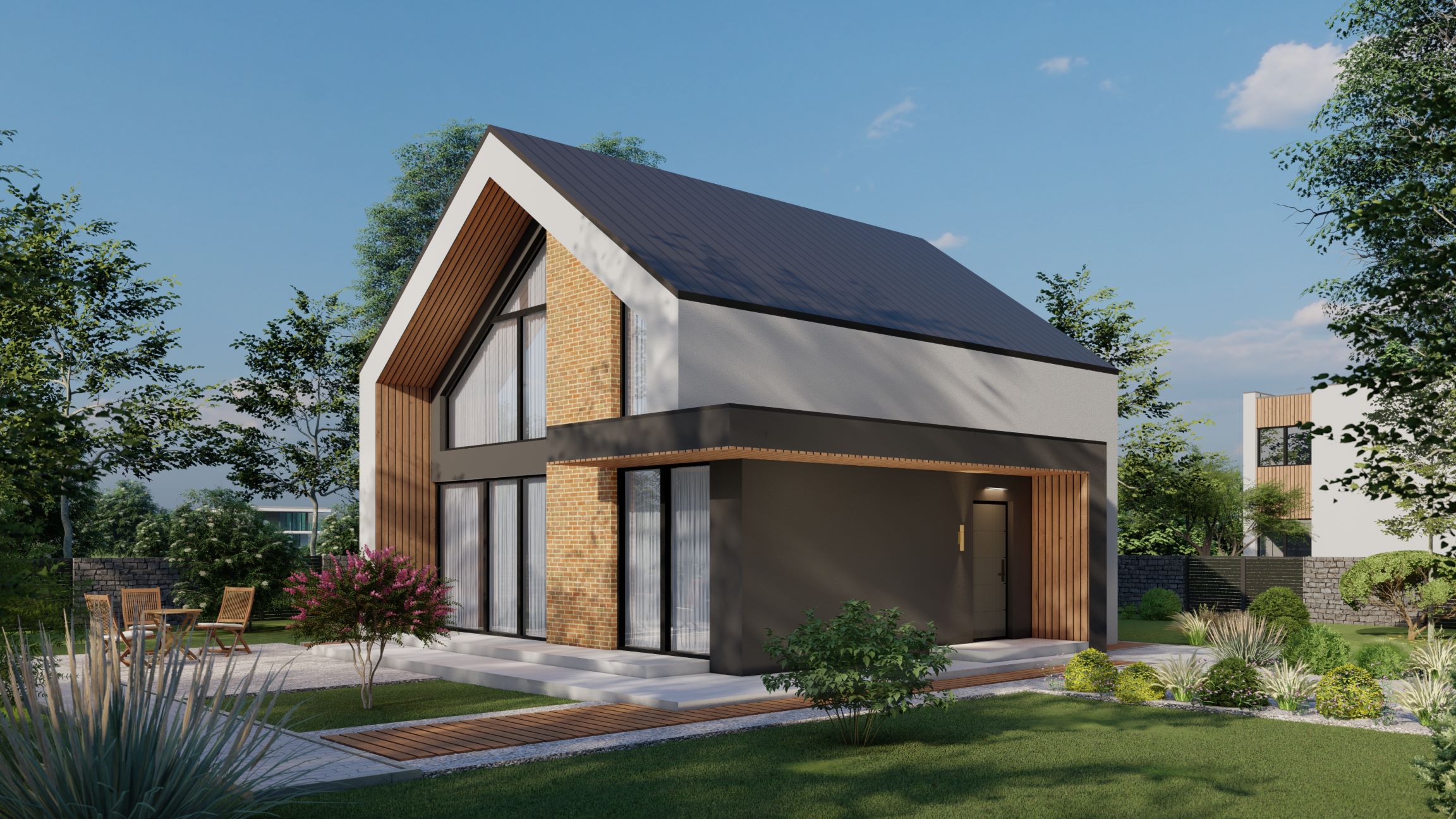 Luminozitate și design exterior: Locuința beneficiază de ferestre înalte, ce permit o iluminare naturală abundentă în toate încăperile, creând o atmosferă deschisă și primitoare. Fațadele sunt finisate cu placări moderne din cărămidă aparentă și riflaje de lemn, adăugând un accent cald și natural designului scandinav minimalist. Acoperișul fără streașină, specific stilului nordic, oferă un aspect curat și contemporan, contribuind la eficiența energetică a casei.