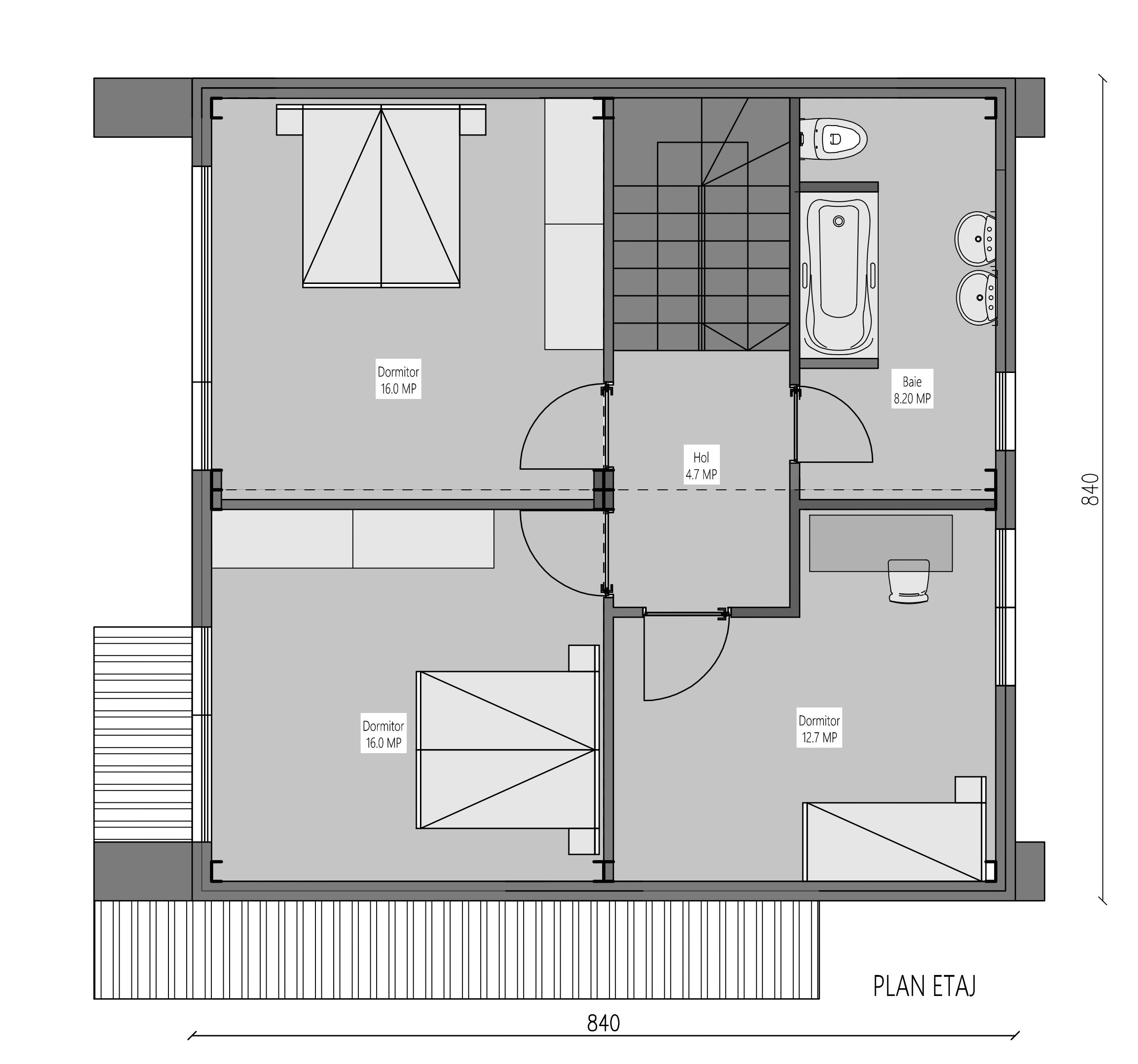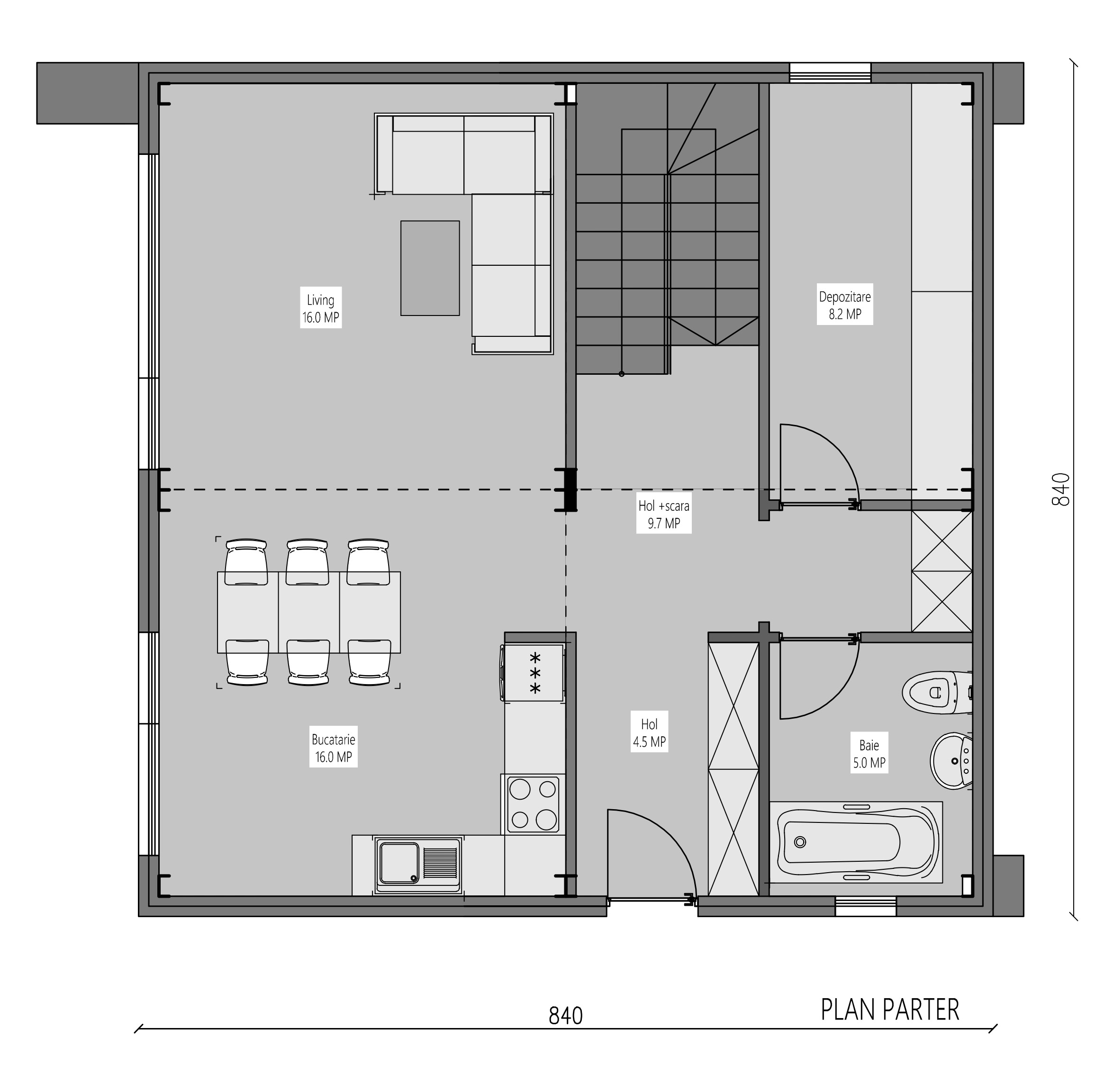 Organizare funcțională pe etaje: La parter se află zona de zi, compusă dintr-un living spațios, o bucătărie deschisă cu loc de luat masa, o baie și o cameră tehnică. Acest nivel este destinat activităților de zi, oferind spații generoase și bine delimitate, ideale pentru viața de familie și socializare. La mansardă, zona de noapte include trei dormitoare și o baie, asigurând intimitate și confort, într-un spațiu liniștit, dedicat odihnei.
