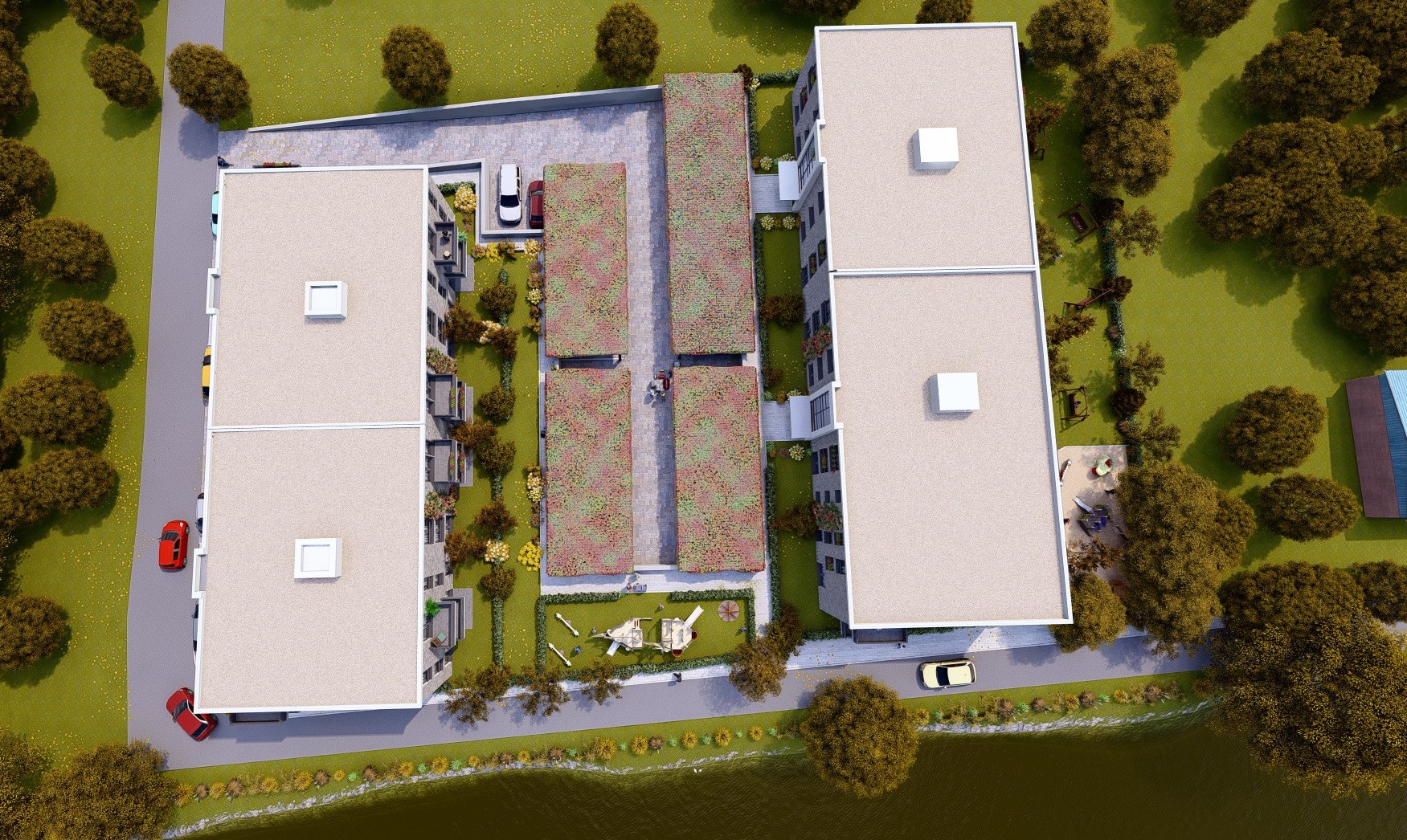 Pentru confortul locatarilor și o viață suburbană liniștită, proiectul include dotări moderne, cum ar fi două locuri de joacă pentru copii, spații de interacțiune pentru comunitate și zone verzi extinse în jurul clădirilor. Cele două blocuri sunt prevăzute cu locuri de parcare exterioare acoperite, oferind locatarilor acces facil și confortabil.