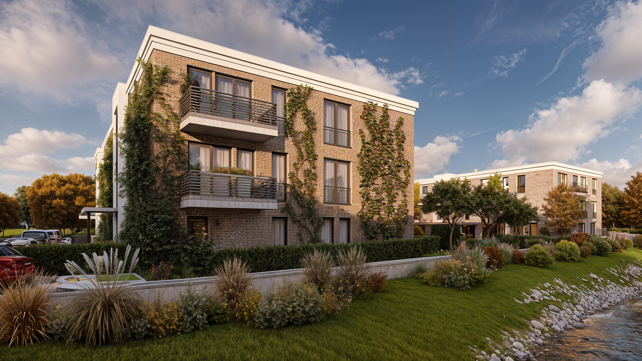 Amplasat într-o zonă rezidențială liniștită din suburbiile orașului Cologne, Germania, acest ansamblu de locuințe colective se integrează armonios în peisajul înconjurător. Proiectul, compus din două blocuri cu două etaje și un total de 35 de apartamente, respectă arhitectura locală și se adaptează perfect caracteristicilor zonale, păstrând un regim de înălțime redus și un aspect care reflectă autenticitatea clădirilor din jur.